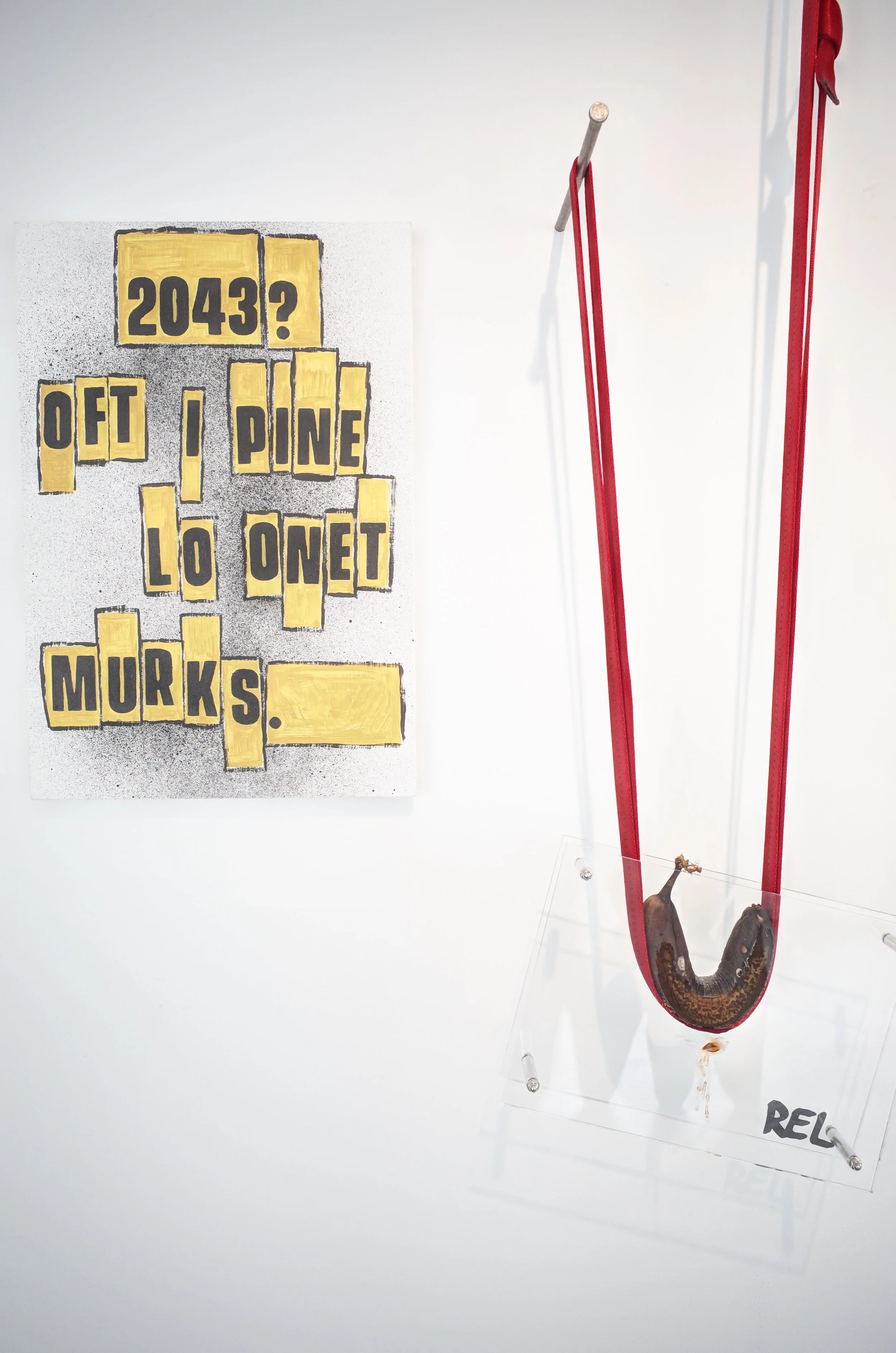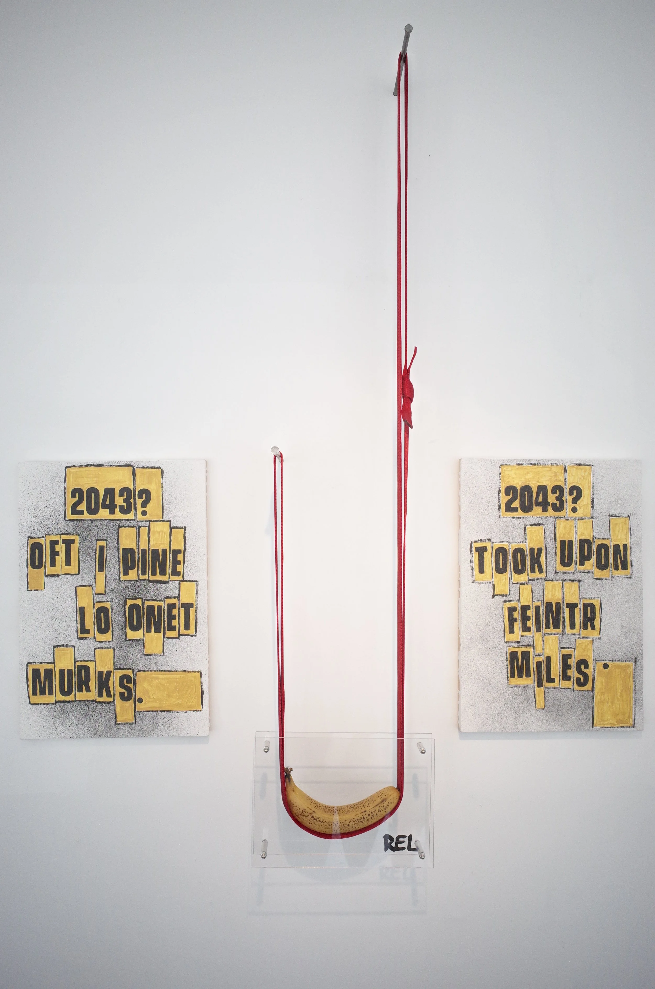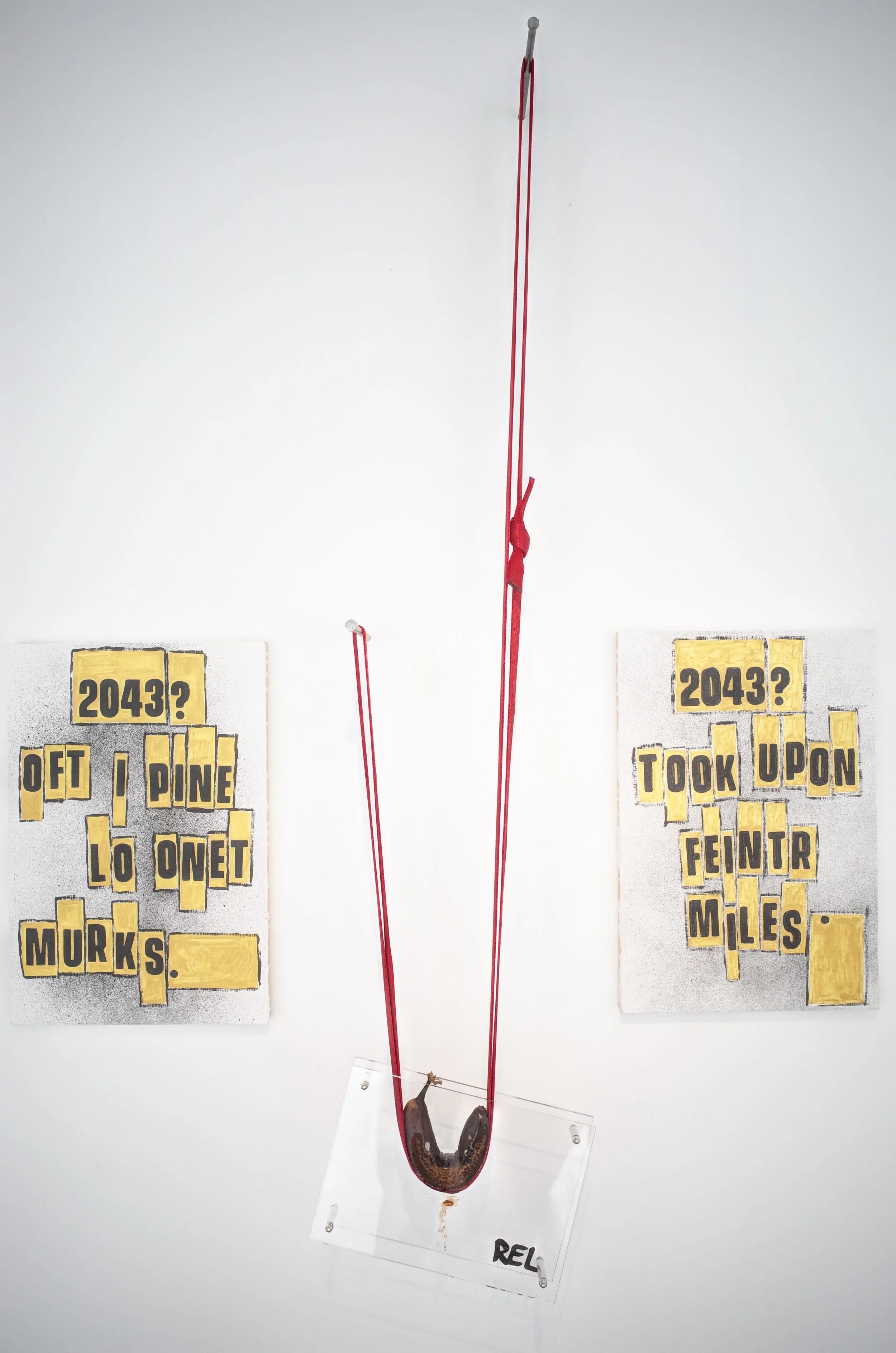 Three of a kind bananas, supporting their frames via webbing and oversize nails, drifting from the yellow of the original sticker towards that of the reproductions, growing tighter in radius before collapsing.