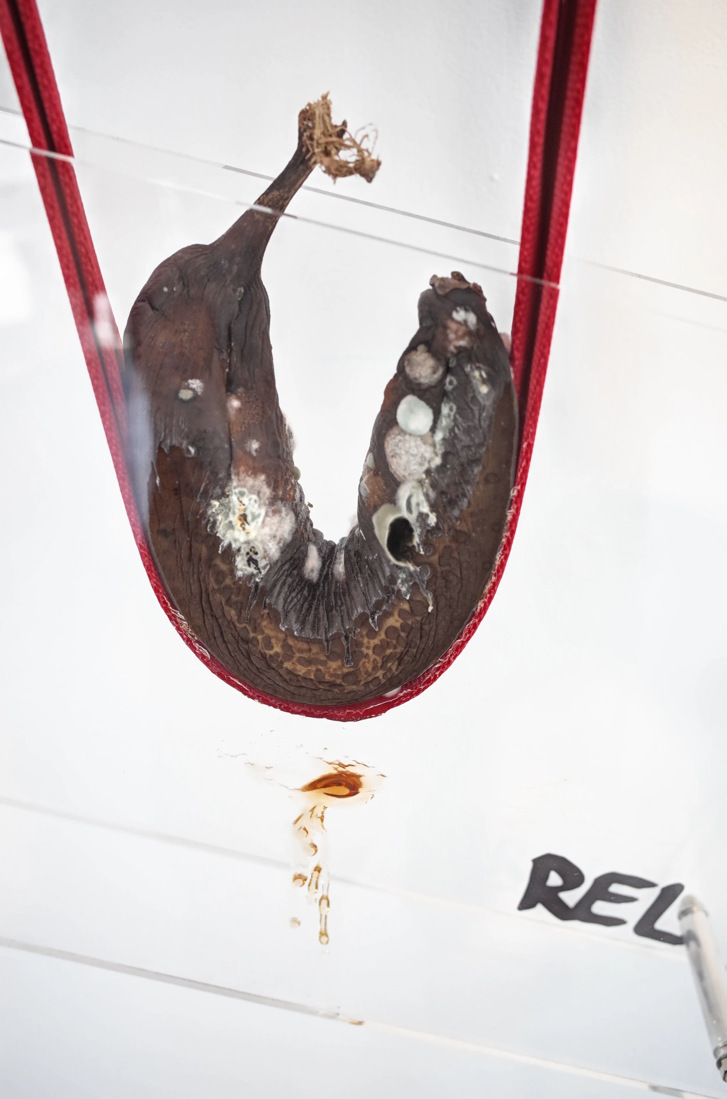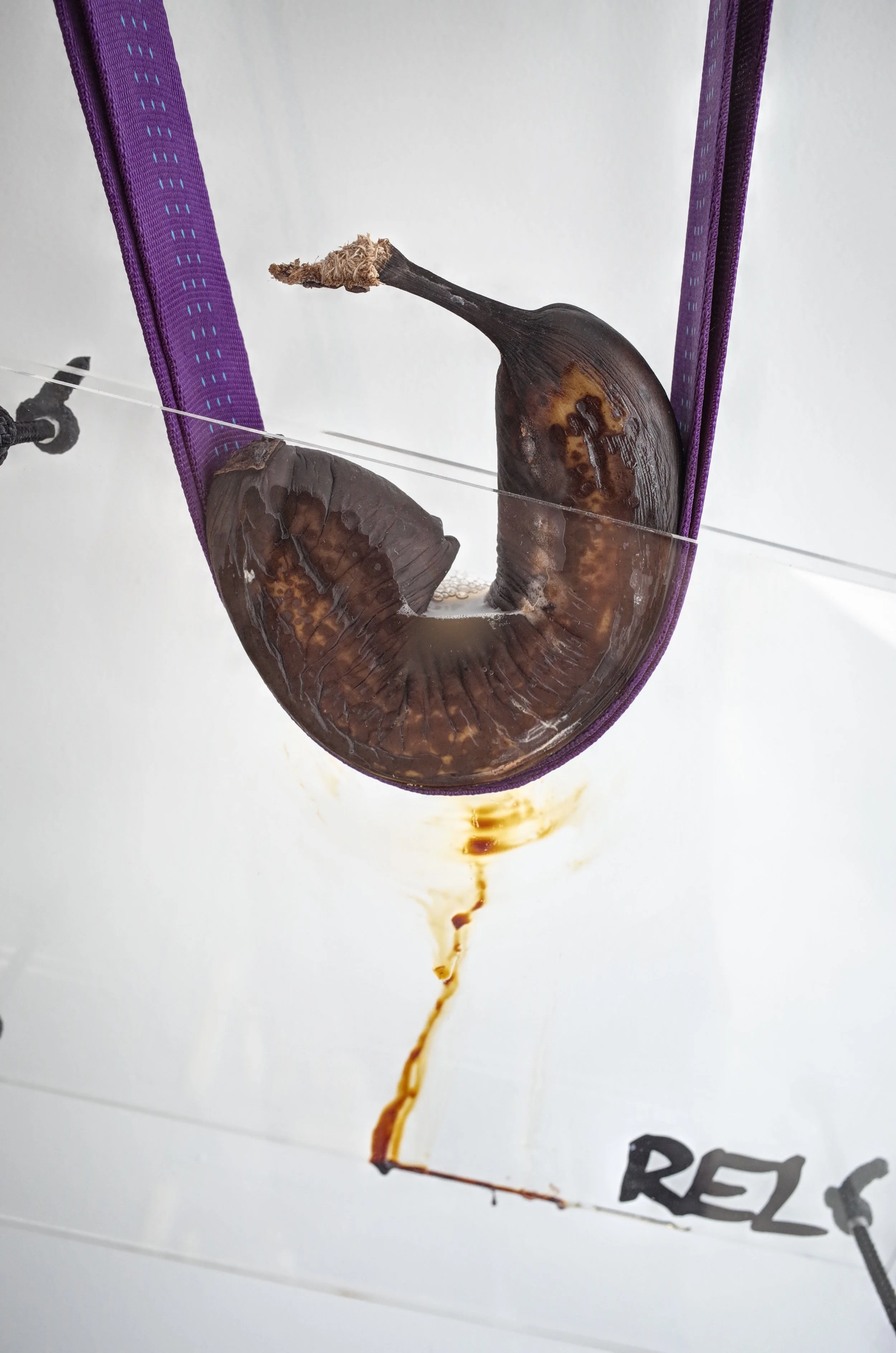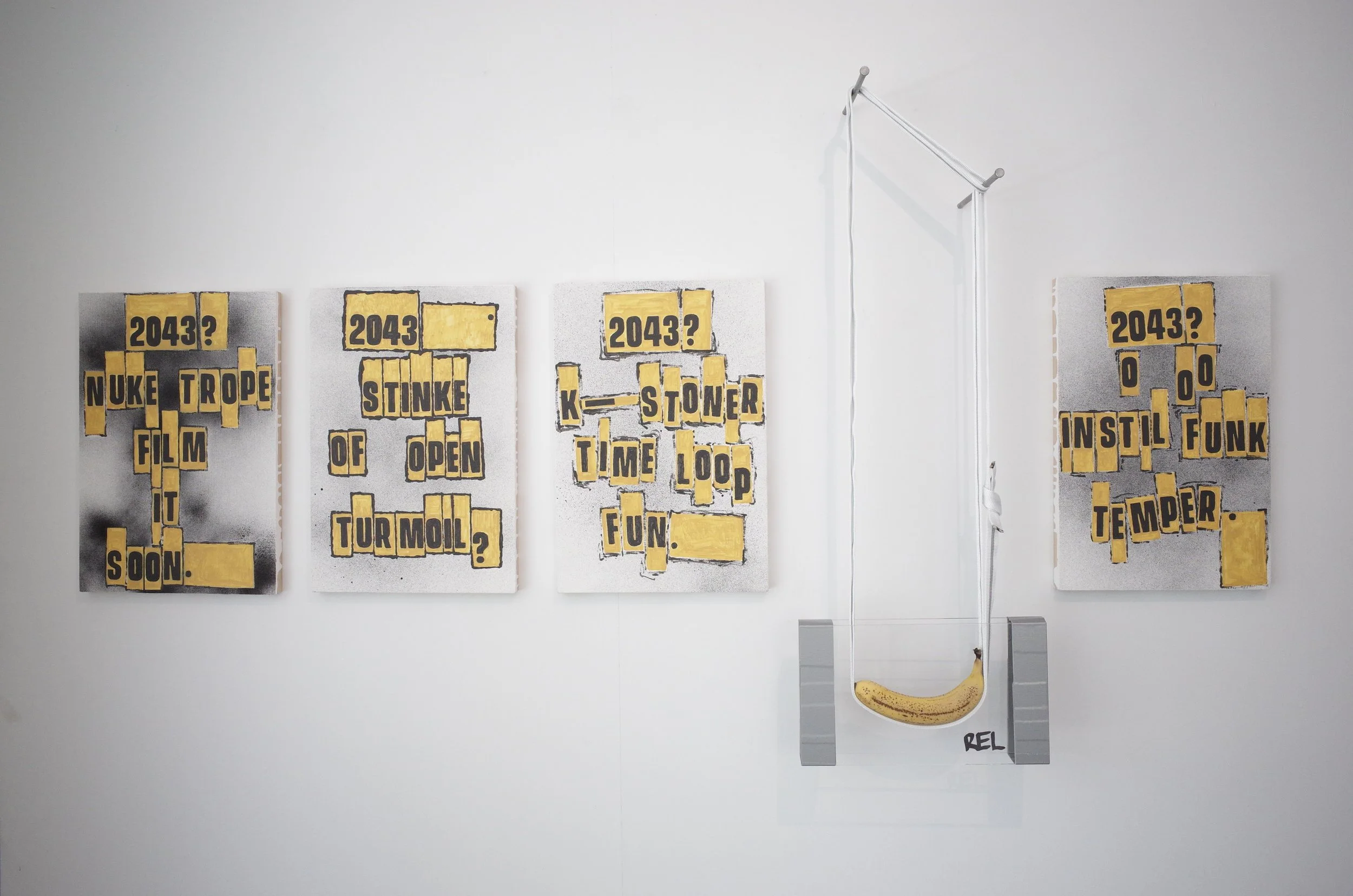 Three of a kind bananas, supporting their frames via webbing and oversize nails, drifting from the yellow of the original sticker towards that of the reproductions, growing tighter in radius before collapsing.