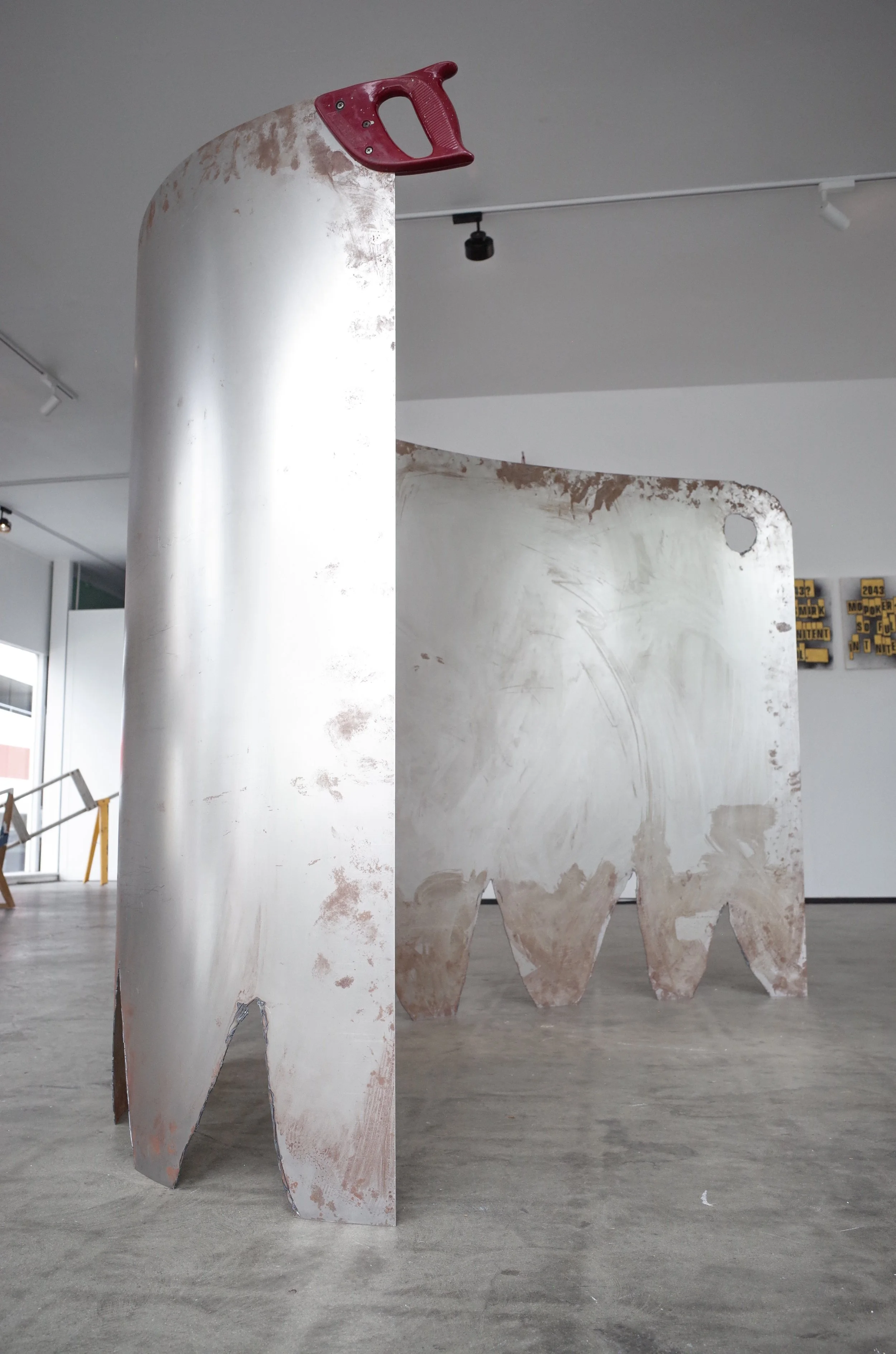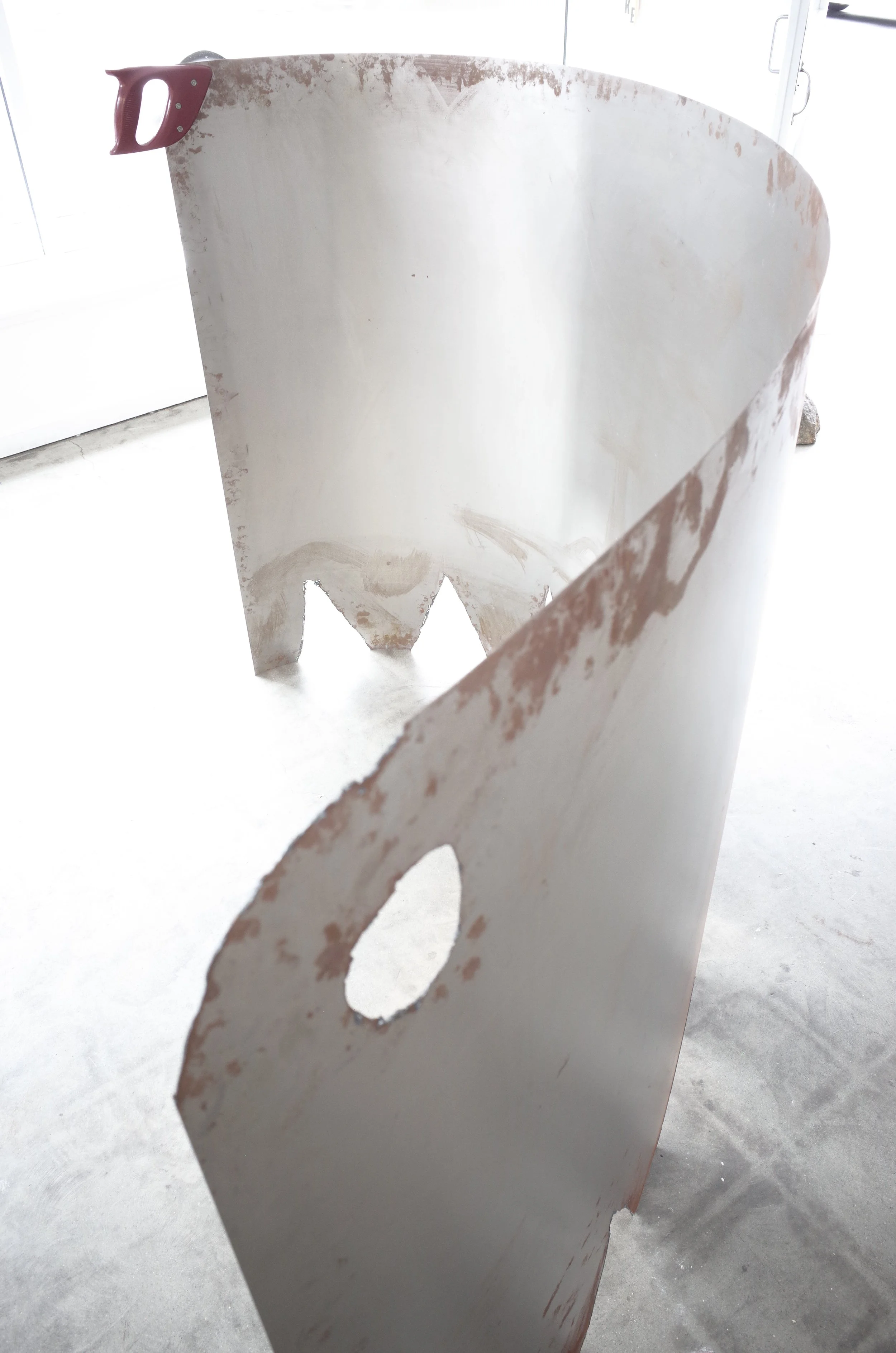 A saw rebuilt with a drawing, rolled into a third dimension with a progressive radius, unable to cut.