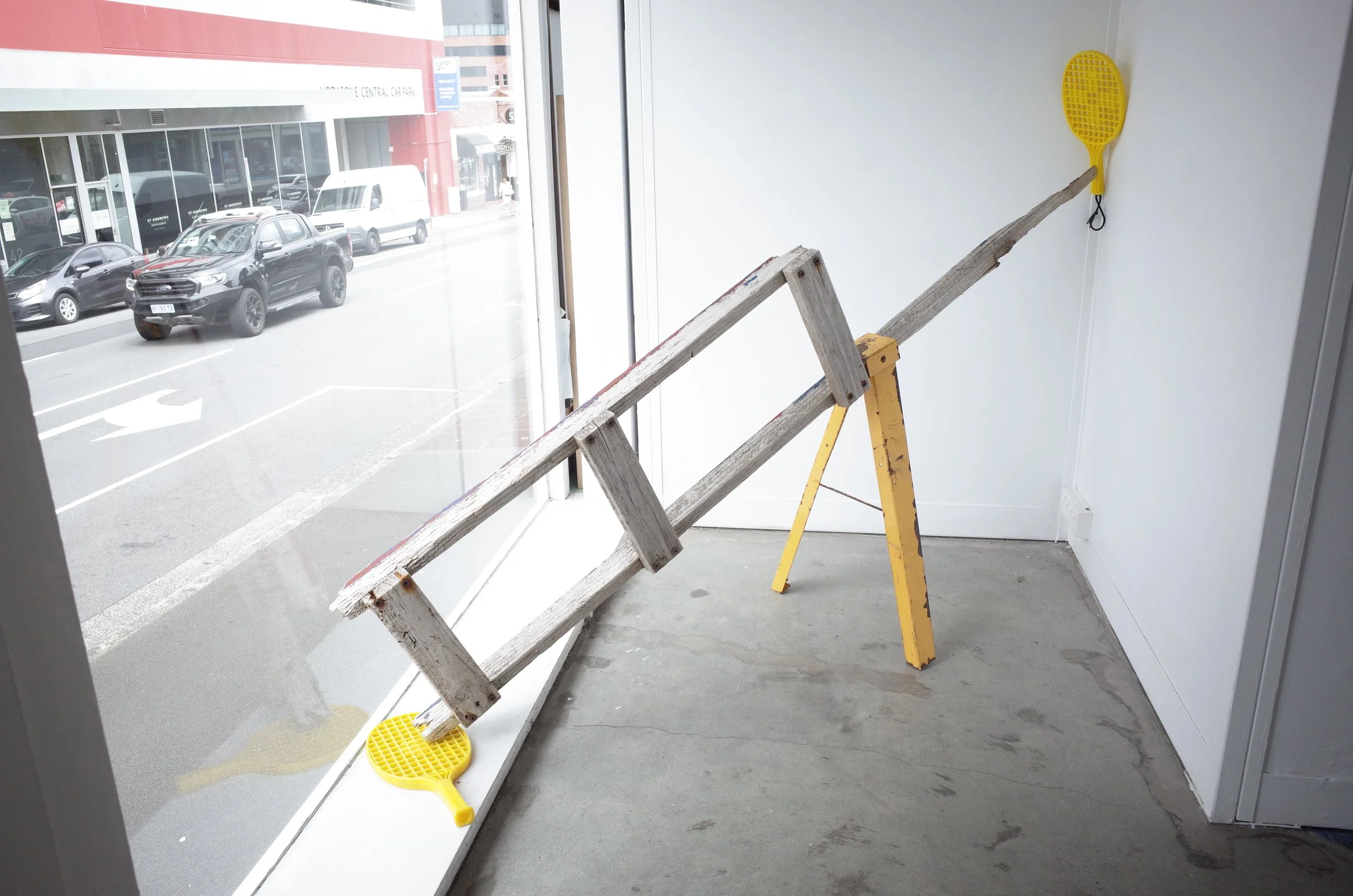 A ladder and saw-horse supporting a totem-tennis game.