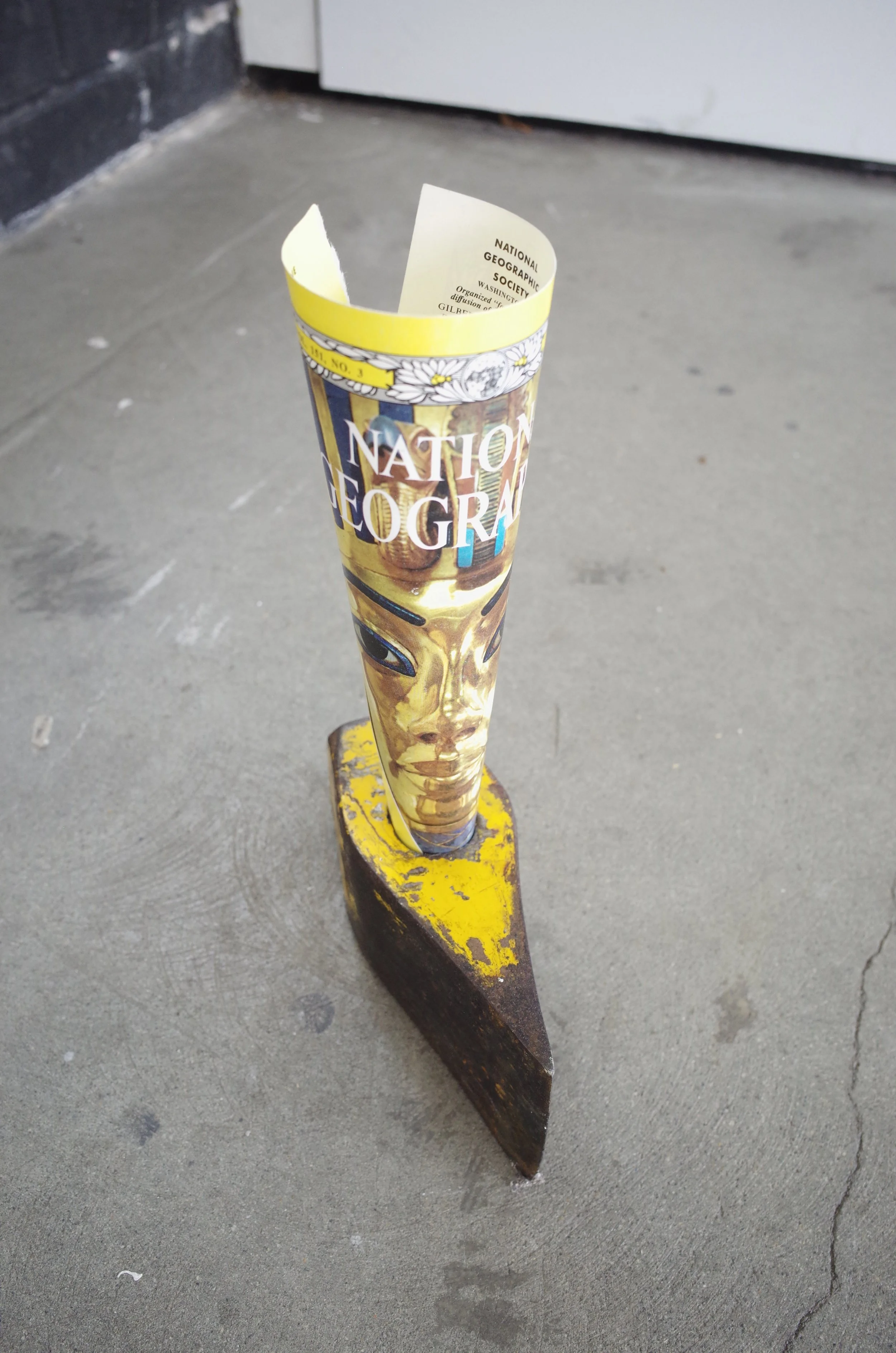 The golden face of an Egyptian casket depicted on a National Geographic cover from 1983, rolled into a cone and held in shape by a splitter head.