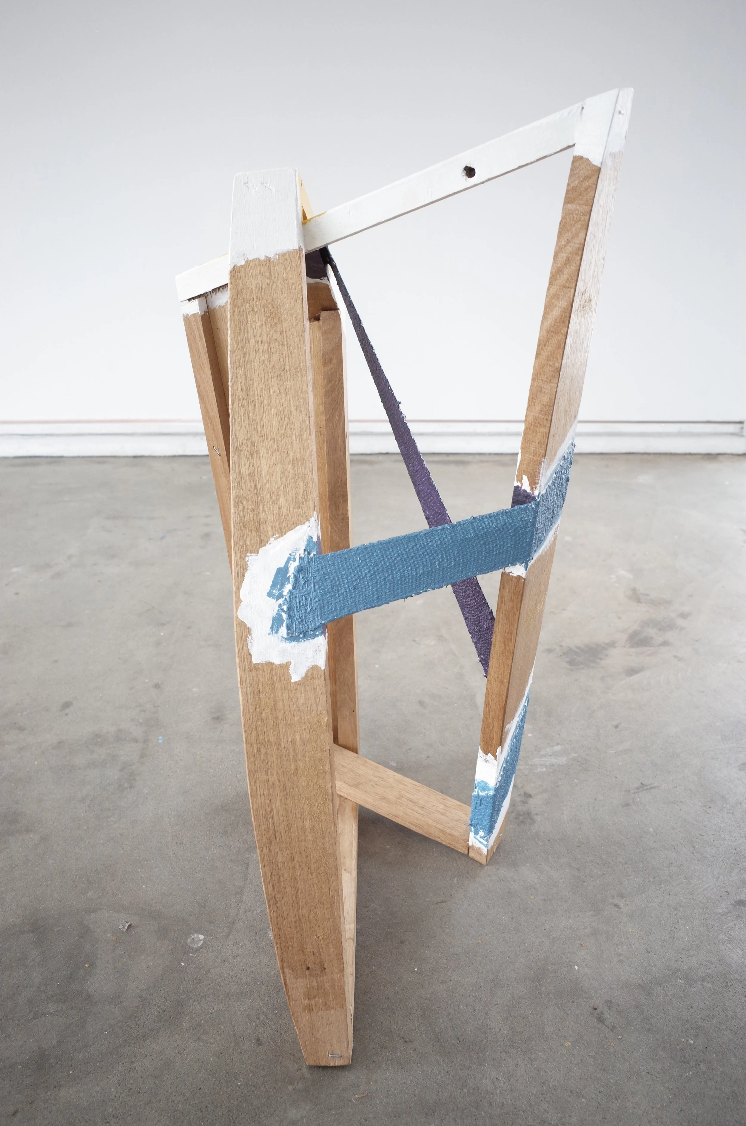 The arms of a deconstructed armchair, held together, one inside the other, by their resistance to the tension of their upholstery webbing, forming loops.