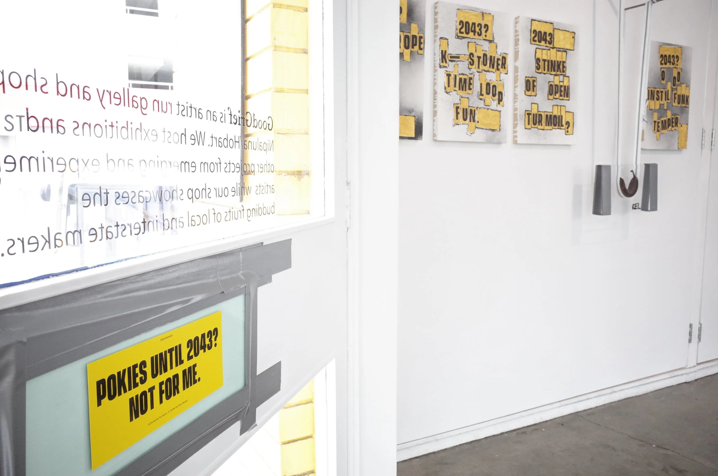 A game of chance played within the constraints of a five year old anti poker-machine sticker, rematerialised with paint to be presented back to Tasmania’s poker machine licensee via an emerging art prize.